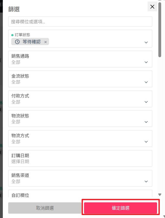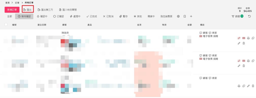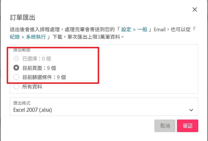 1.可至後台「訂單 > 所有訂單 > 篩選訂單 」。 2.篩選訂單條件,並點選確定篩選。 *可依篩選條進健行排序,可篩選多個條件。 3.篩選完成後可點擊「匯出」。 4.匯出前可以選擇已勾選之內容,當前頁面之內容,或是所有篩選條件之內容。 5.系統會開始執行匯出,匯出結果可點擊右上角小鈴鐺或是前往「紀錄 > 系統執行」查看。 *每次匯出只能匯出六個月。 *如訂單量較多,建議可以每三個月或是每一個月分開匯出,避免匯出時間較長。