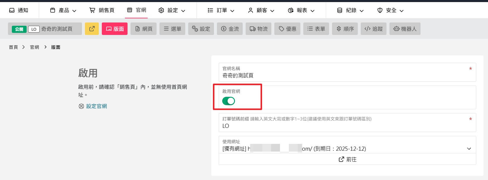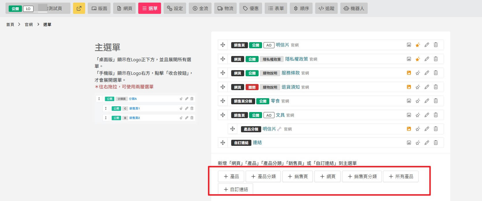 1.至後台「官網 > 版面 >啟用官網 」只有官網頁面才會顯示選單。 (另外您可以參考 設定官網-分類頁 、設定官網-流程) 2.將銷售頁加入官網「銷售頁編輯 > 渠道 > 開啟官網 > 選擇銷售業分類」 3.至「官網 > 選單 」新銷售頁連結。 (另外可以參考 將銷售頁加入官網的兩種方式 )