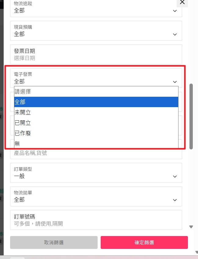 2.可在電子發票欄位篩選「無、等待處理、已開立、已作廢」之訂單。