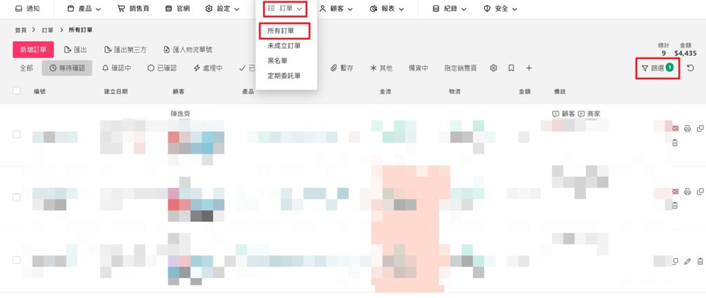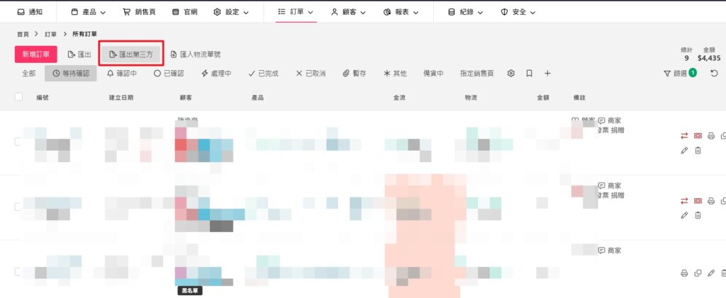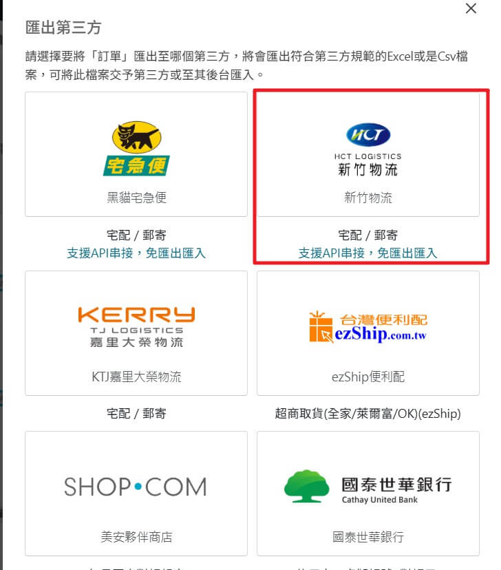 1.至「訂單 > 所有訂單 >篩選訂單 > 篩選宅配訂單」。 2.完成篩選條件後,點選匯出第三方。 3.會跳出匯出格式,選擇新竹物流。 4.匯出資訊如下。 5.到新竹物流後台「寄貨 > 匯入整批銷貨出貨」上傳檔案。