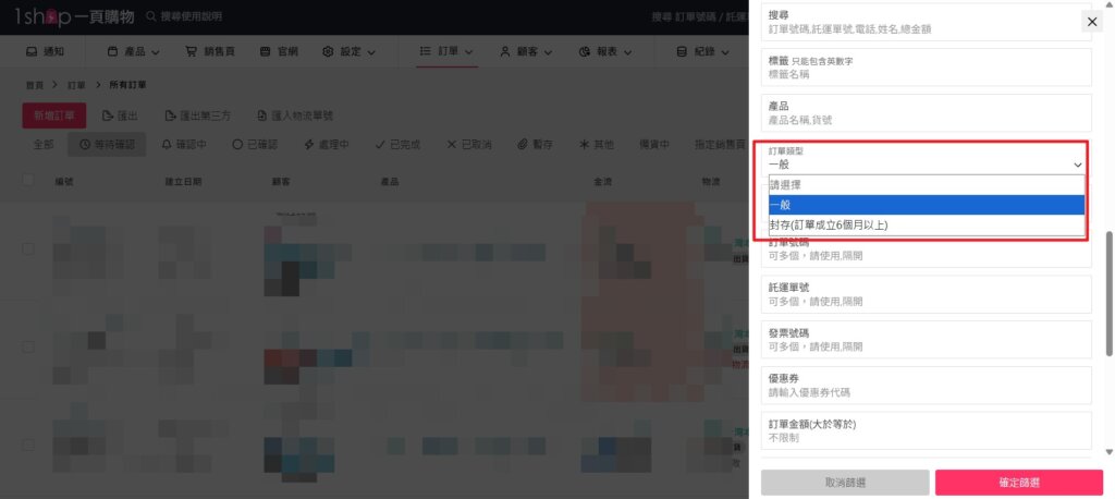 為增加網頁處理效能,系統會將訂單建立超過6個月,自動封存。 如需查詢封存定單,請依照以下方式 1.「訂單 > 所有訂單」點擊「篩選」,選擇訂單類型「封存」,並按下「確認篩選」。 *封存後,顧客即無法查看訂單。