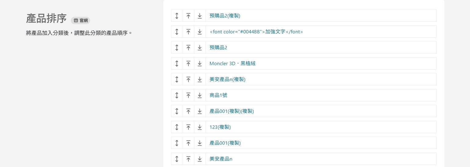 例如:A產品加入到 排序1 的產品分類,再將 排序1 移動到 排序2 第二層,後續再將 排序1 移動到第一層。A產品就會同時有 排序1 與 排序2 的產品分類。