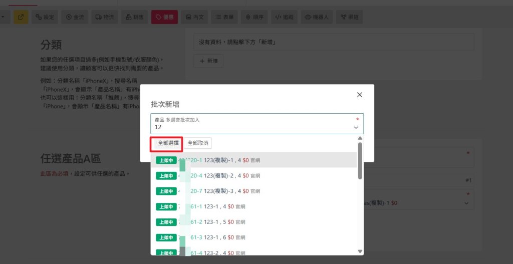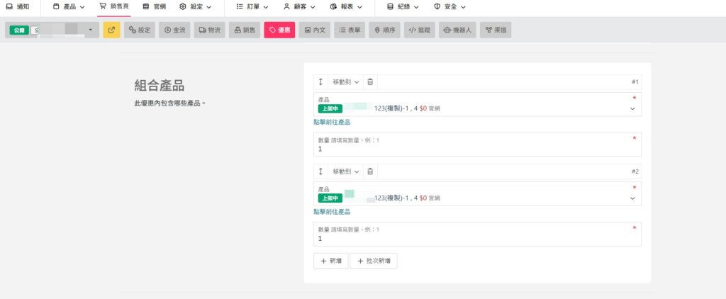 1.至「銷售頁 > 優惠 > 新增優惠 > 建立優惠」 , 並參考 如何開啟前台各項欄位
