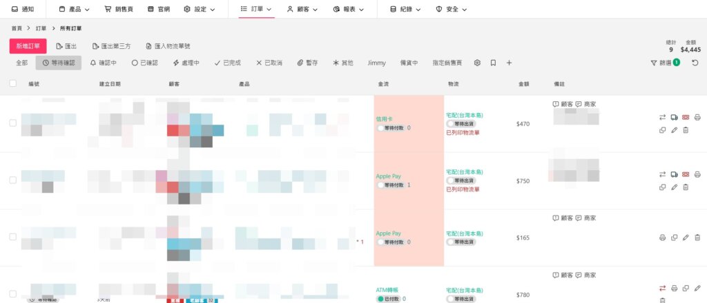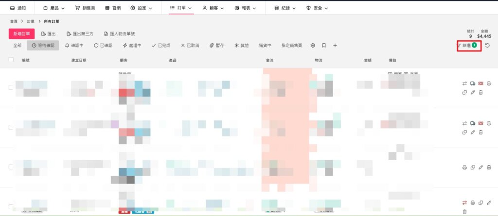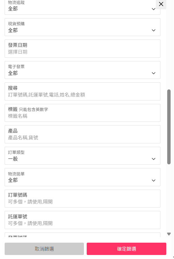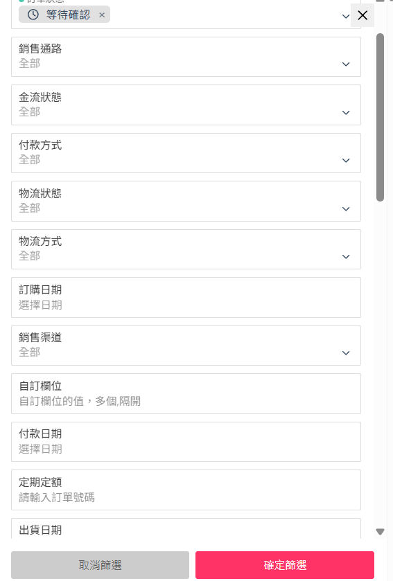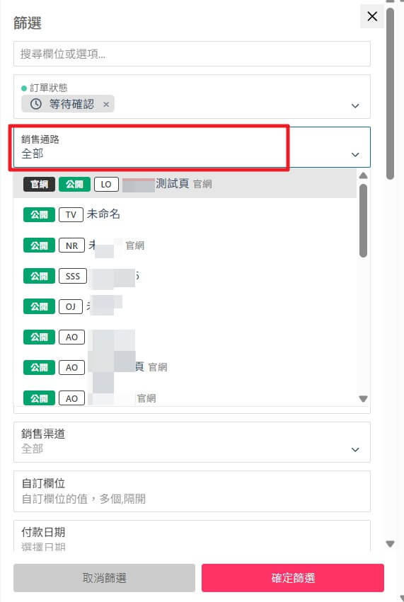 1.可至訂單列表右上方,點選篩選功能進行訂單篩選。 2.可供篩選之條件有,訂單狀態、銷售通路、金流狀態、付款方式、物流狀態、物流方式、訂購日期、銷售渠道,自訂欄位、付款日期,等不同的篩選條件。 3.輸入篩選條件,例如:搜尋銷售頁,可點選「銷售通路」。 4.點選確定篩選,篩選頁面。 *可配合檢視畫面功能,儲存常用篩選條件。