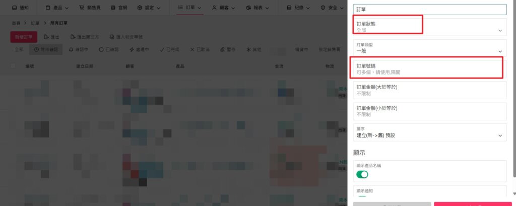 2.前往1shop後台,前往訂單,將剛剛複製的訂單號碼在「篩選 > 訂單號碼」貼上,並於訂單狀態欄位改為「全部」即可顯示訂單。
