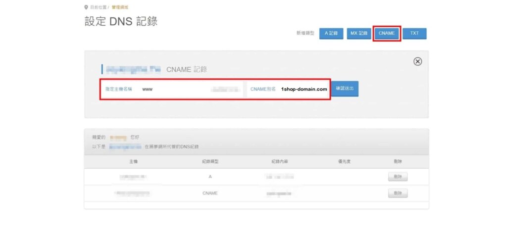 6. 指定主機名稱輸入子網域「www」,CNAME別名輸入「 1shop-domain.com」並確認送出。